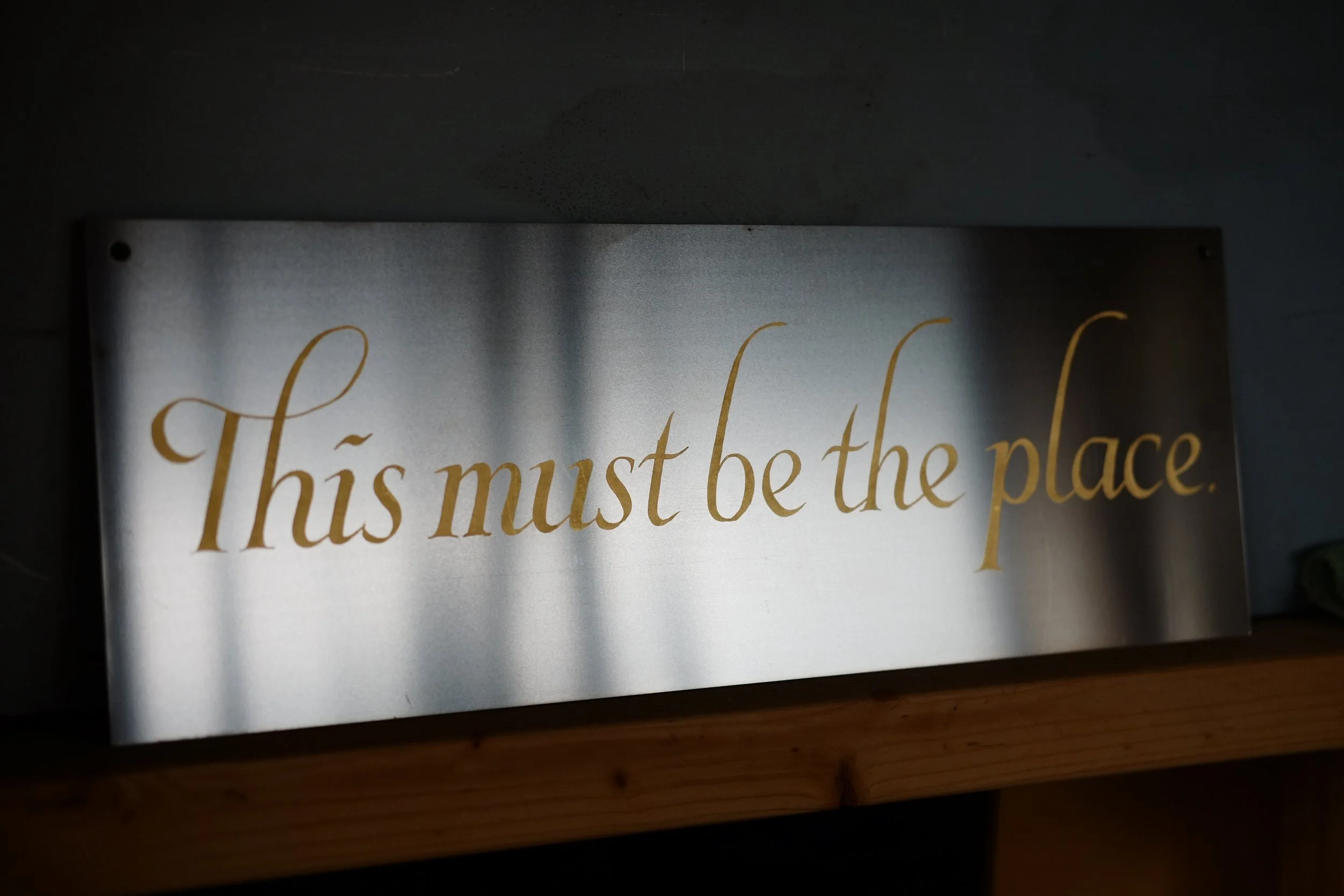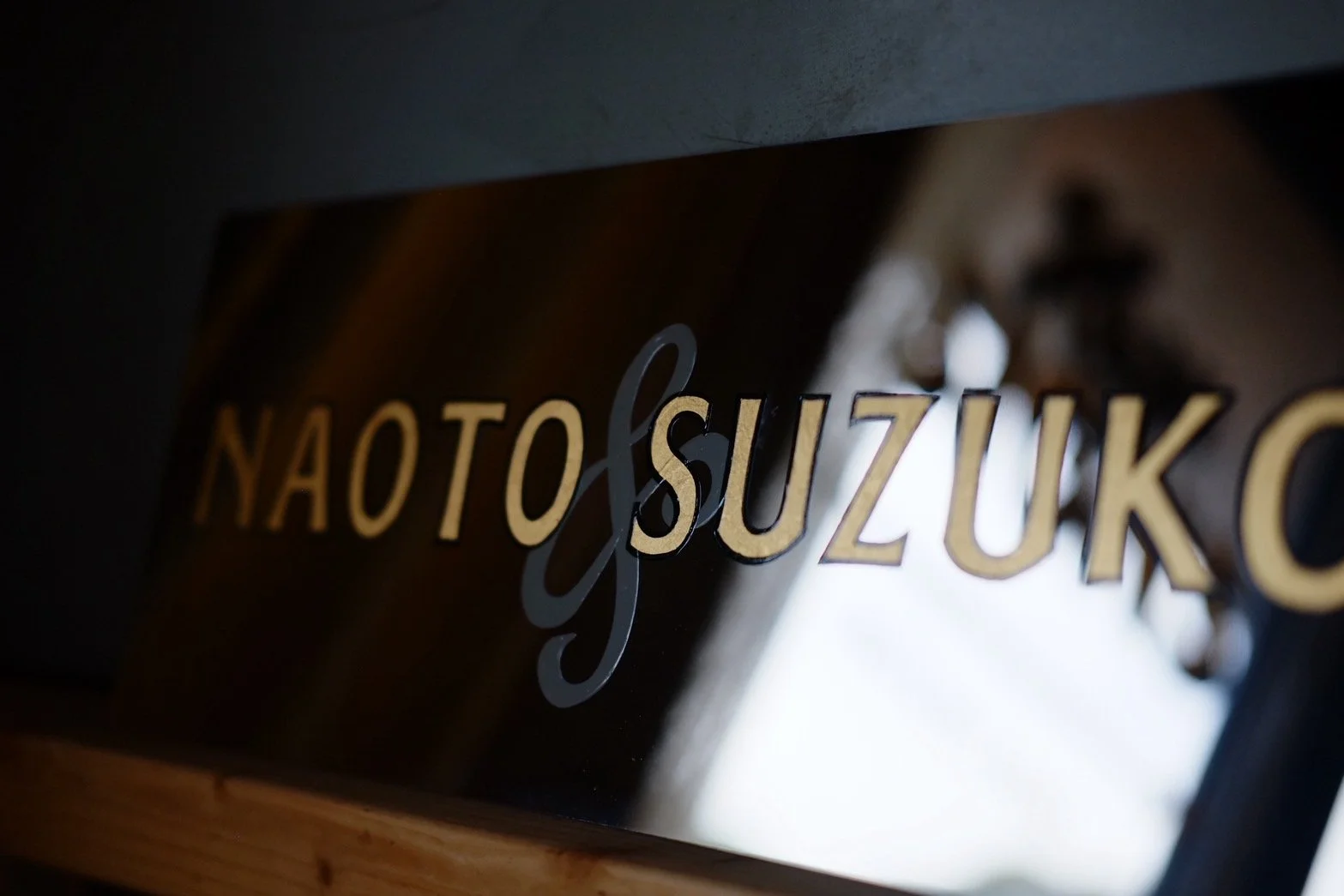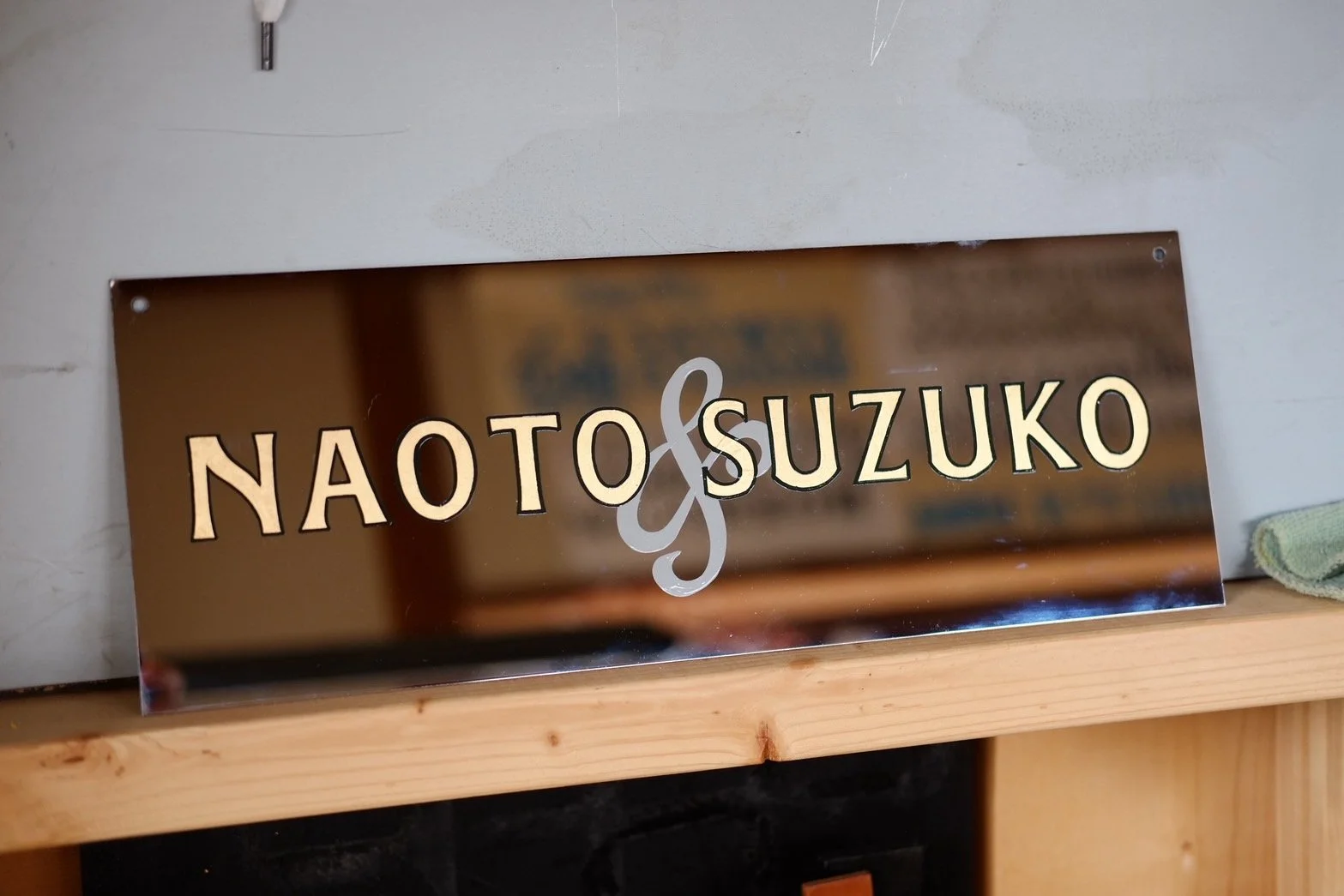 Wedding Plate結婚パーティでウェルカムサインとして飾られるプレートにギルディング(金箔施工)。表は奥行きあるデザイン、裏はシンプルなイタリックのデザイン。趣の異なるデザインにして楽しめるようにしました。SUS板はクライアント様支給です。
